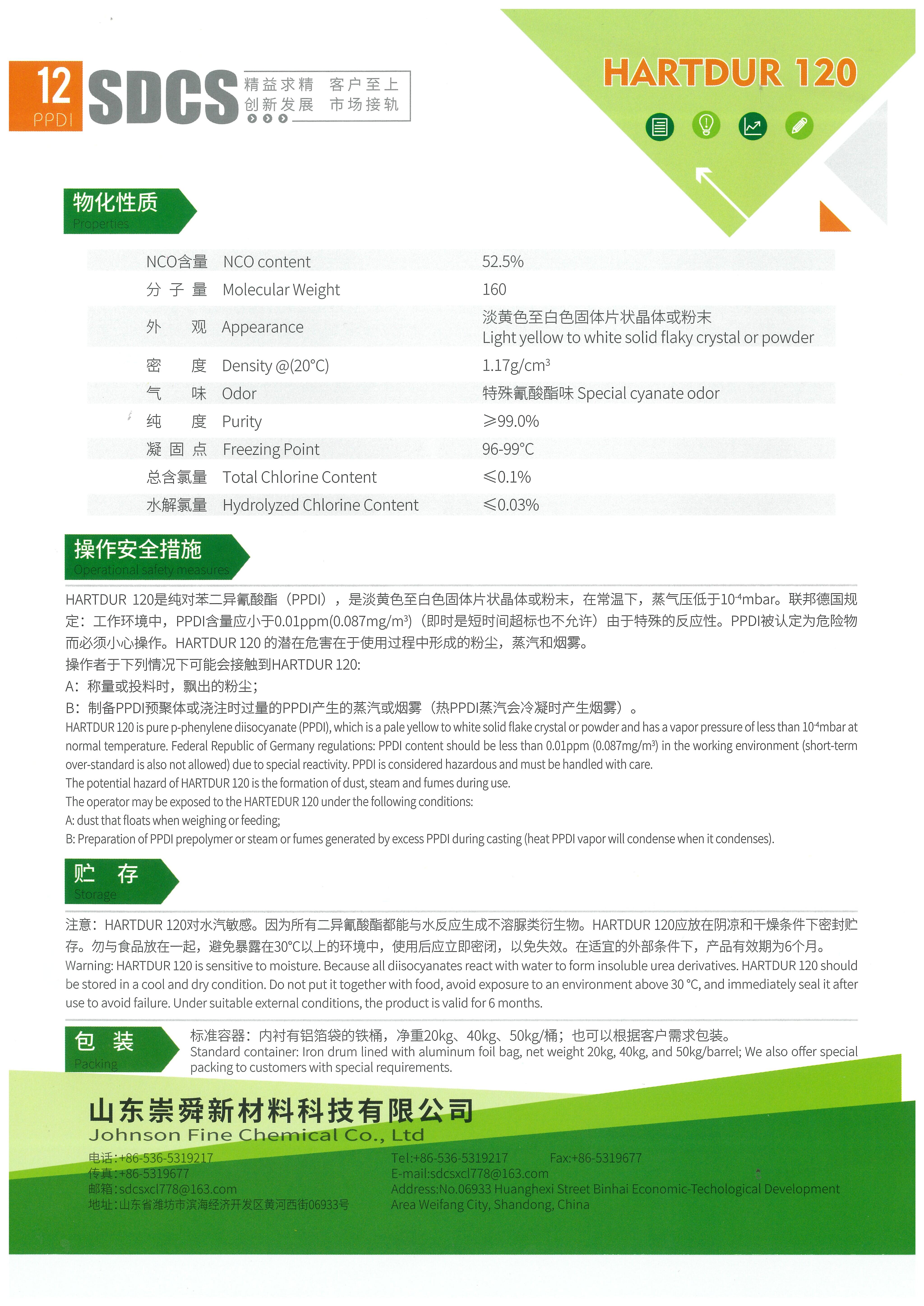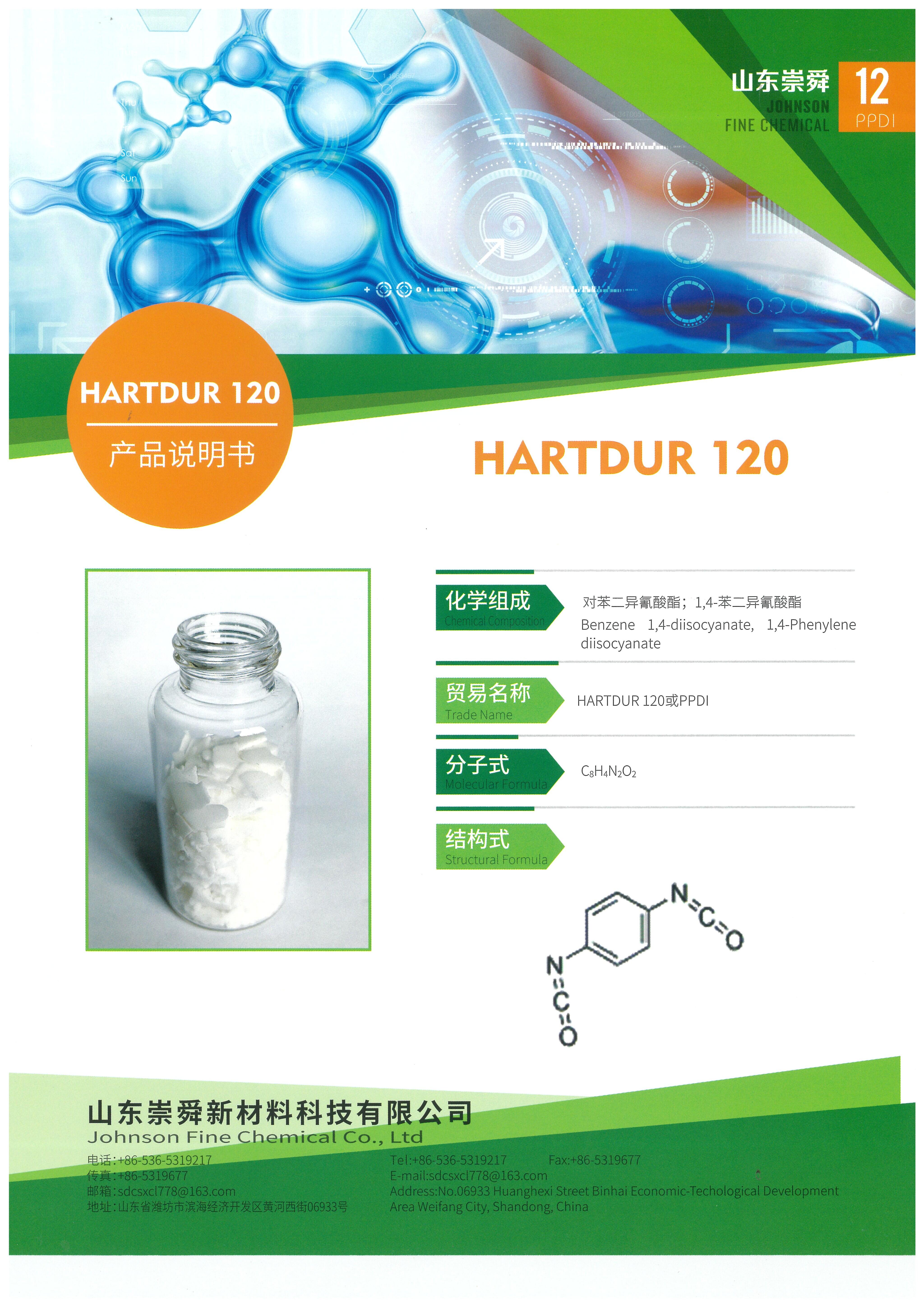 Caution: HARTDUR 120 (PPDI) is very sensitive to moisture. Water reacts with all diisocyanates to form insoluble urea derivatives. HARTDUR 118(TODI) should be stored in tightly sealed containers in cool and dry conditions. Do not put PPDI along with food and avoid exposing in an environment above 30℃. After using, the lid must be sealed immediately in case of dysfunction. Under suitable external conditions, PPDI is valid for six months at least with effect from the date on which it’s delivered.