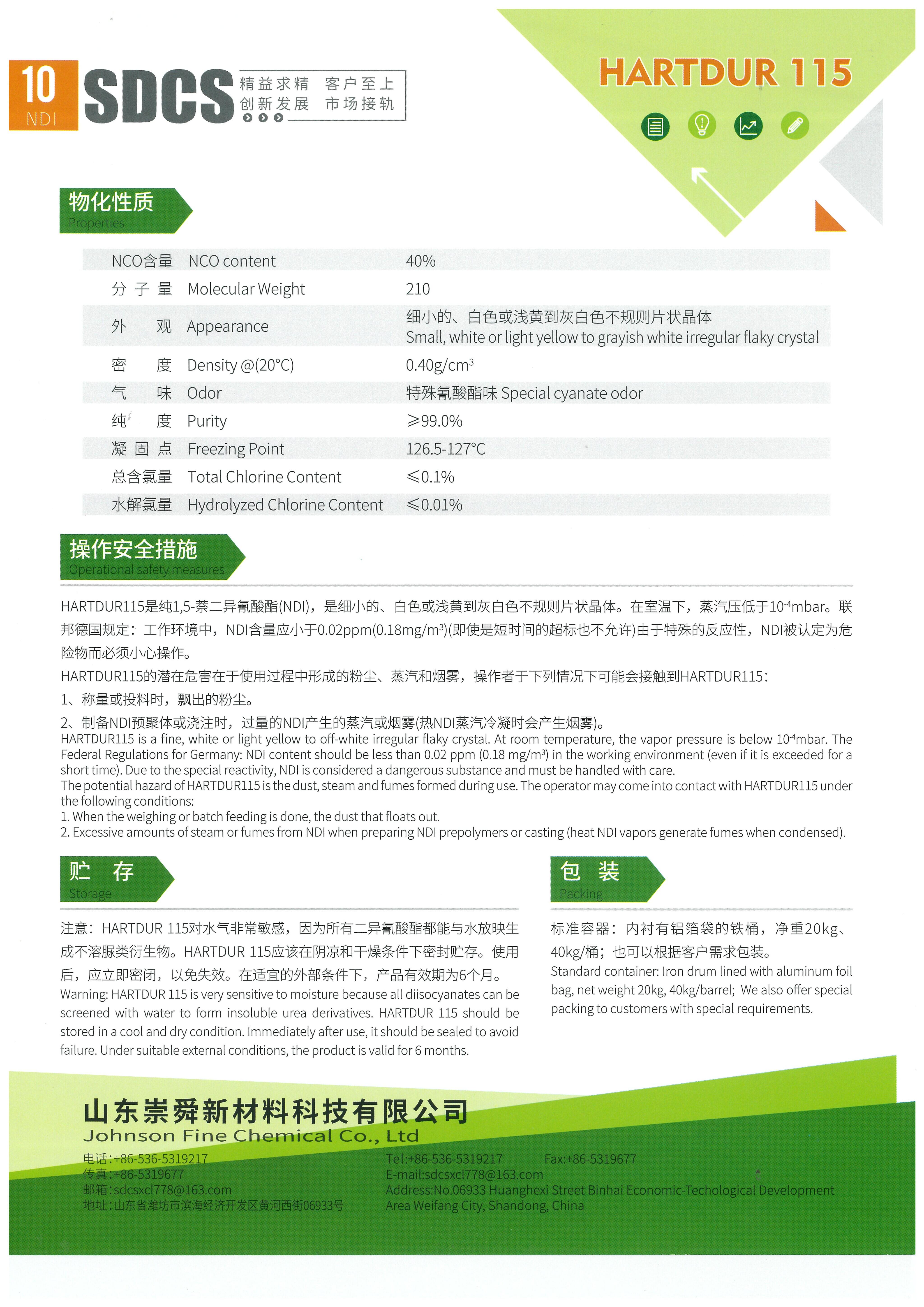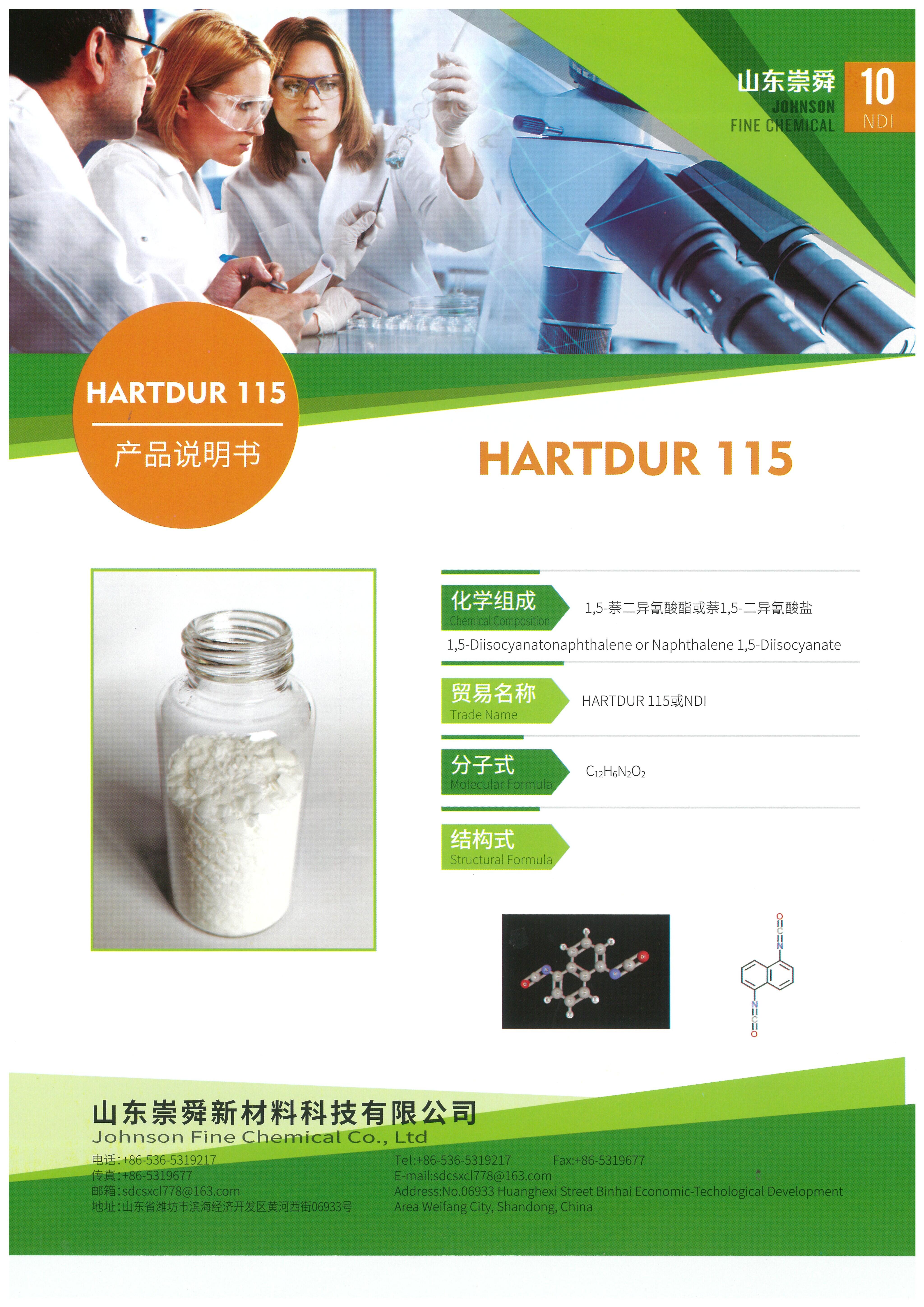 HARTDUR 115 (NDI), formally known as 1,5-naphthalene diisocyanate, represents a distinctive class of aromatic isocyanates, setting itself apart from conventional varieties such as methylene diphenyl diisocyanate (MDI) and toluene diisocyanate (TDI) through its enhanced structural rigidity and elevated melting point. When integrated into polyurethane (PU) formulations, HARTDUR 115 significantly augments the structural integrity and longevity of the end products, offering superior resistance to wear and high temperatures. This attribute renders it particularly suitable for the fabrication of high-quality, durable mechanical components. Furthermore, HARTDUR 115 is utilized as a versatile chemical intermediate in the synthesis of advanced agricultural chemicals and pharmaceutical compounds.