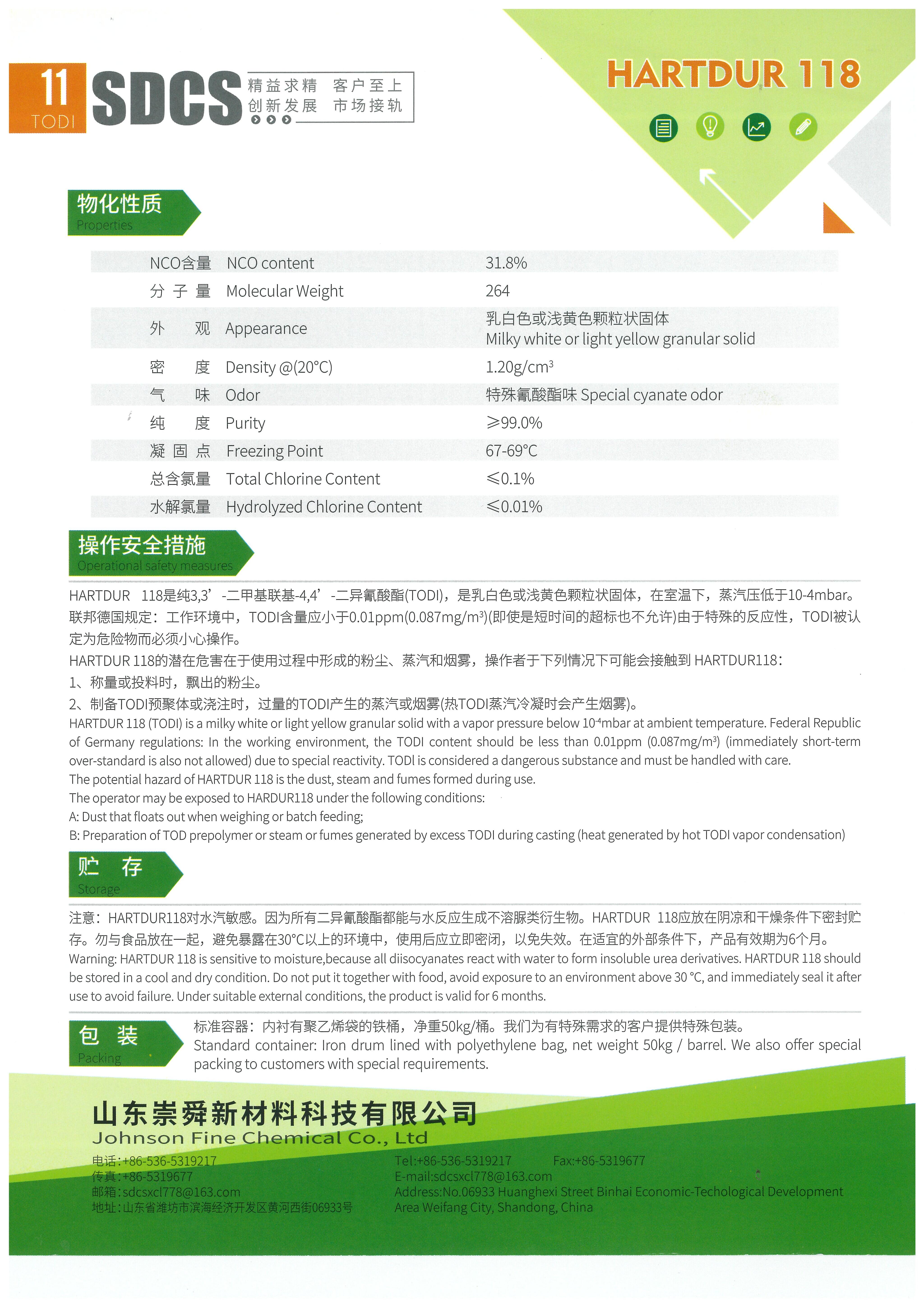 HARTDUR 118(TODI) is sensitive to moisture. Water reacts with all diisocyanates to form insoluble urea derivatives. HARTDUR 118 (TODI) should be stored in tightly sealed containers in cool and dry conditions. Do NOT put TODI along with food and avoid exposing in an environment above 30℃. After using, the lid must be sealed immediately in case of dysfunction. Under suitable storage conditions, TODI is valid for six months at least with effect from the date on which it’s delivered.
