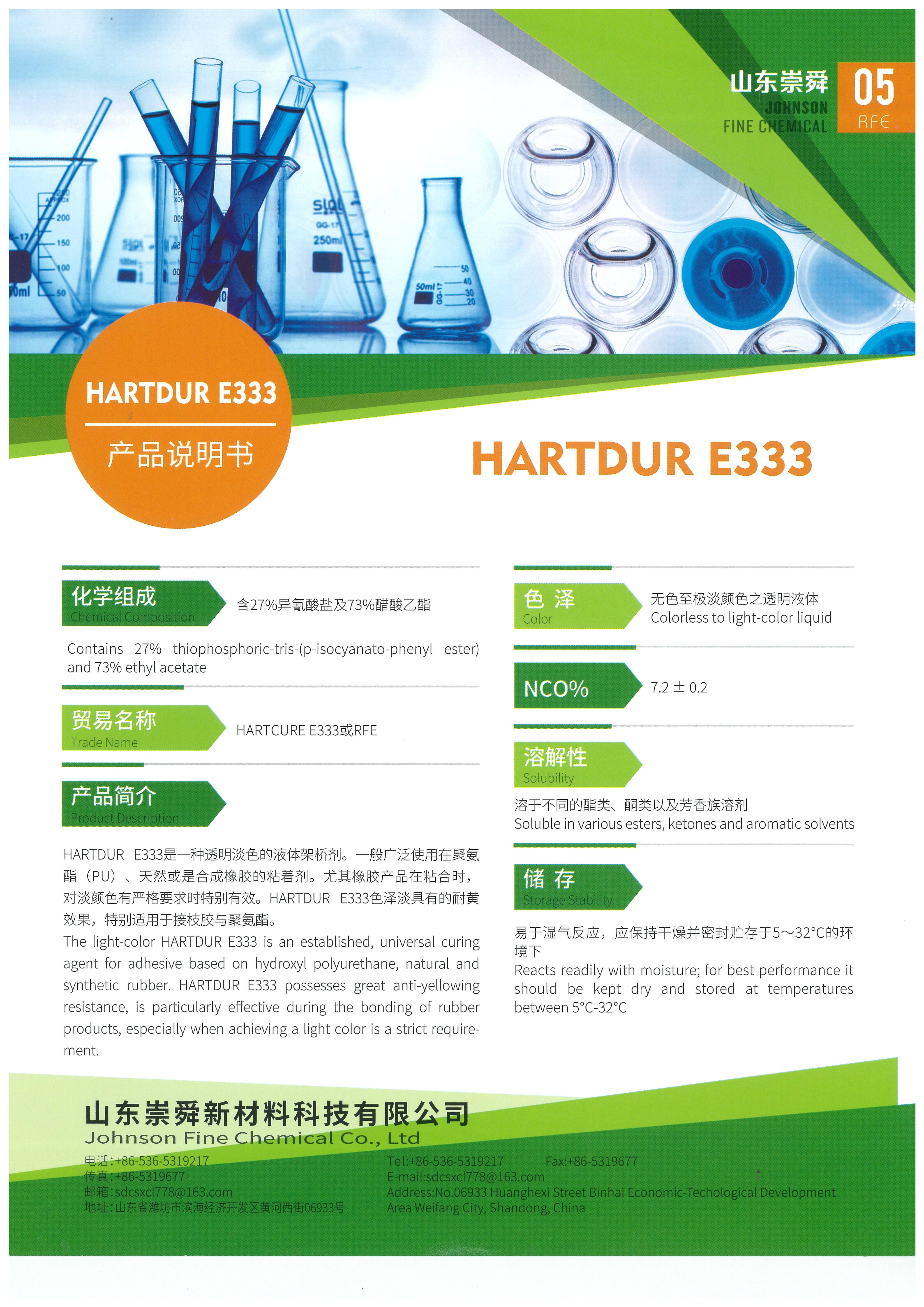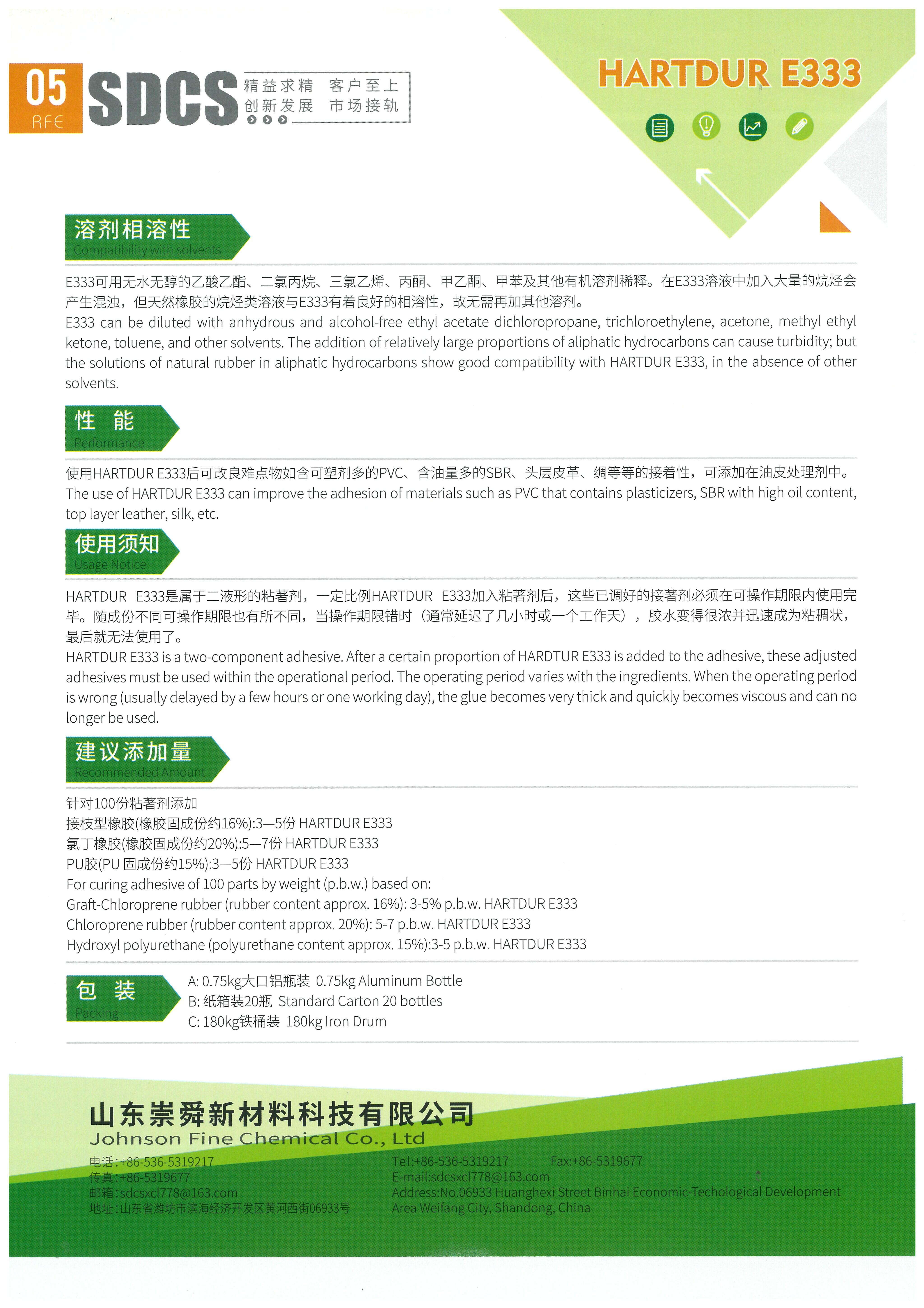 HARTDUR E333 can be diluted with anhydrous and alcohol-free ethyl acetate dichloropropane, trichloroethylene, acetone, methyl ethyl ketone, toluene and other solvents. Adding relatively large proportions of aliphatic hydrocarbons can result in turbidity. However, the solution of aliphatic hydrocarbons in natural rubber(NR) shows good compatibility with HARTDUR E333. Thus, there is no need to add other solvents.