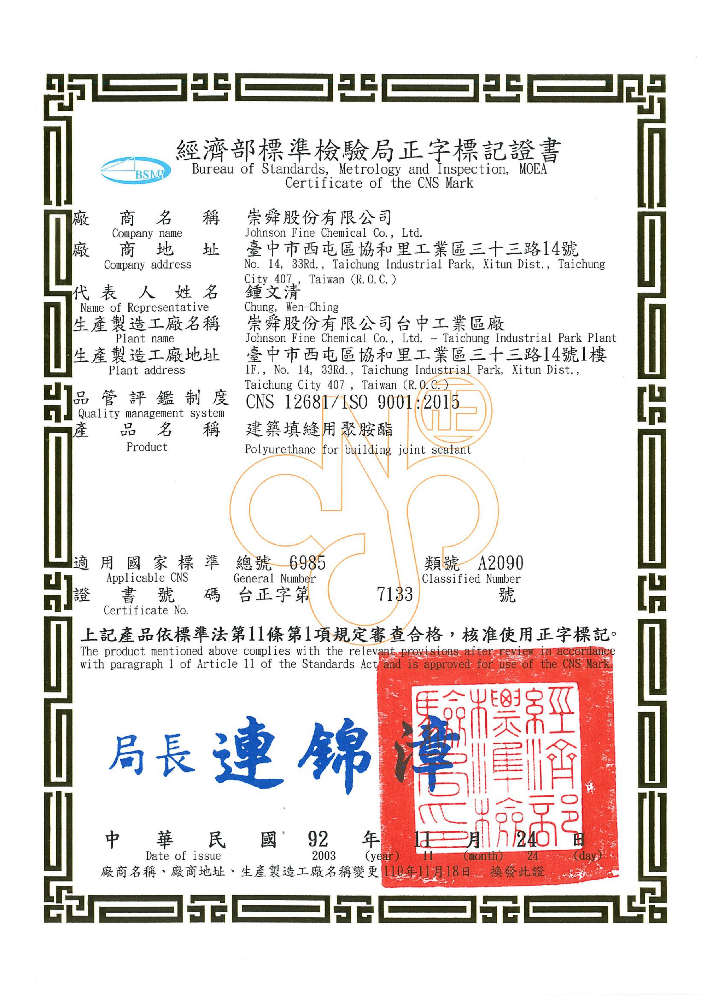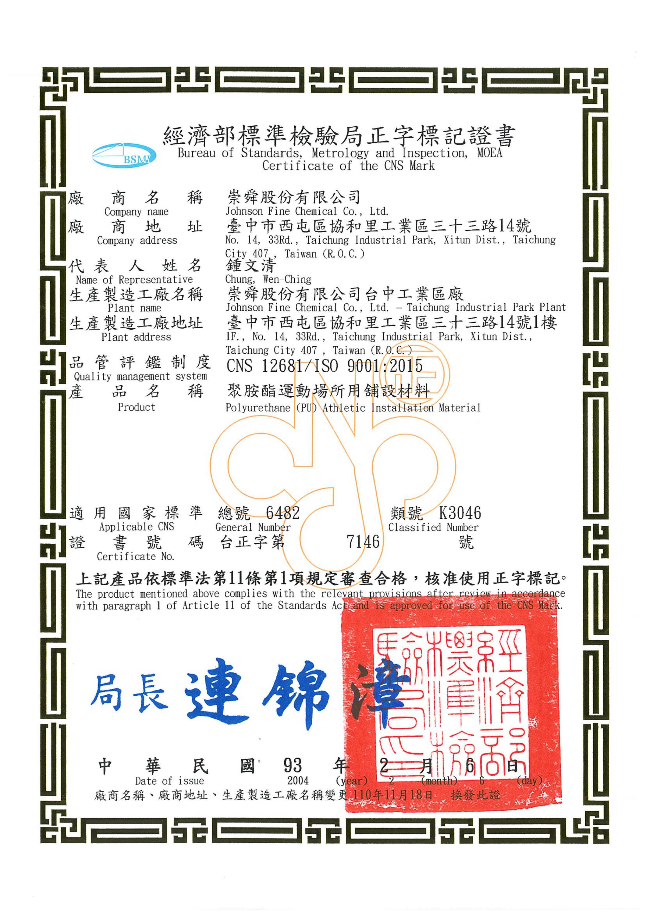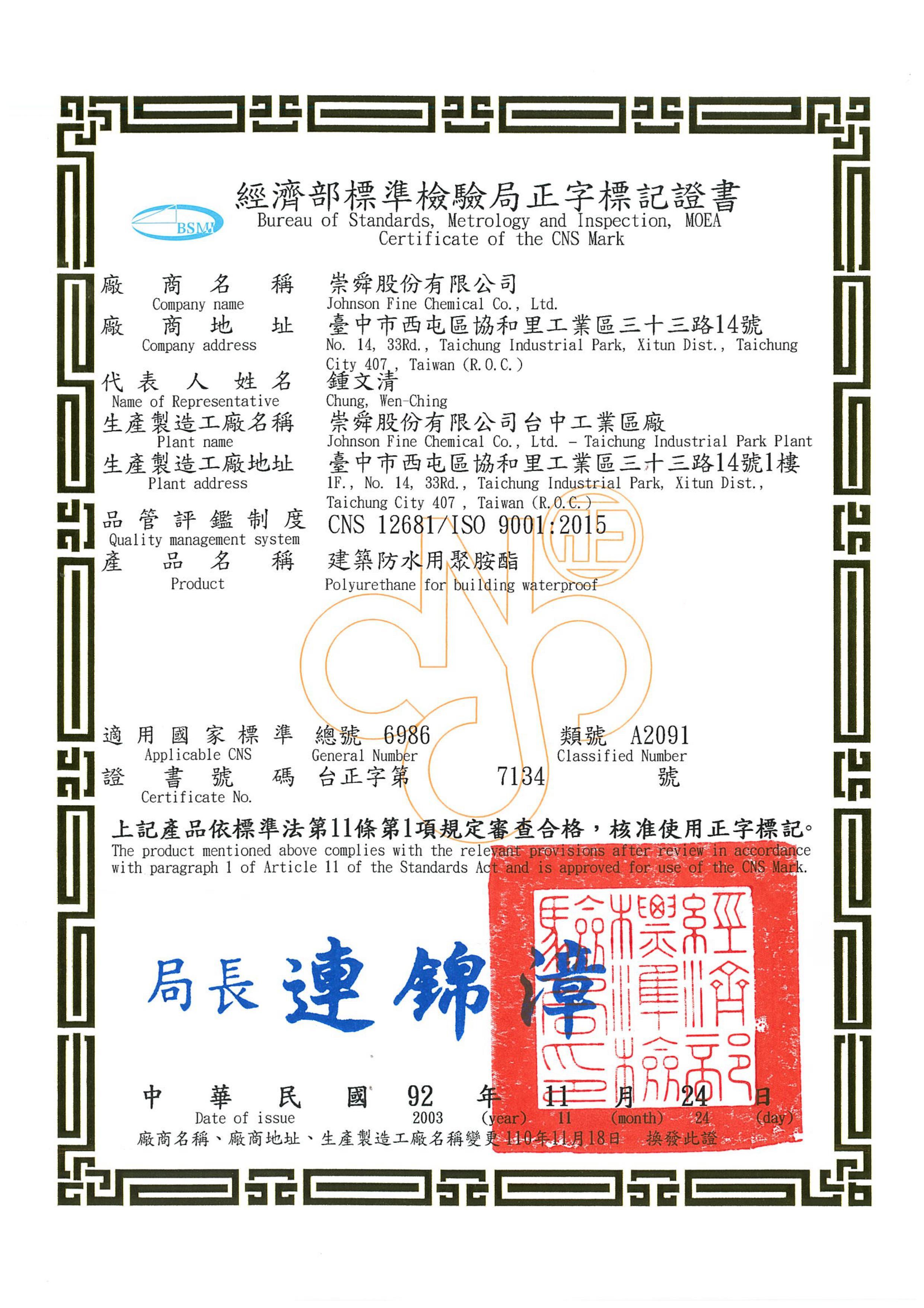 Committed to providing customers with the highest quality products, Johnson Fine Chemical’s PU resin coating complies with the National Standards of the Republic of China (CNS). As a manufacturer, the quality management adopted by our company complies with the designated quality control system (CNS 12681/ISO 9001), to win the trust of customers to expand the market. You can also purchase suitable and high-quality products easily through CNS Mark to protect your rights!