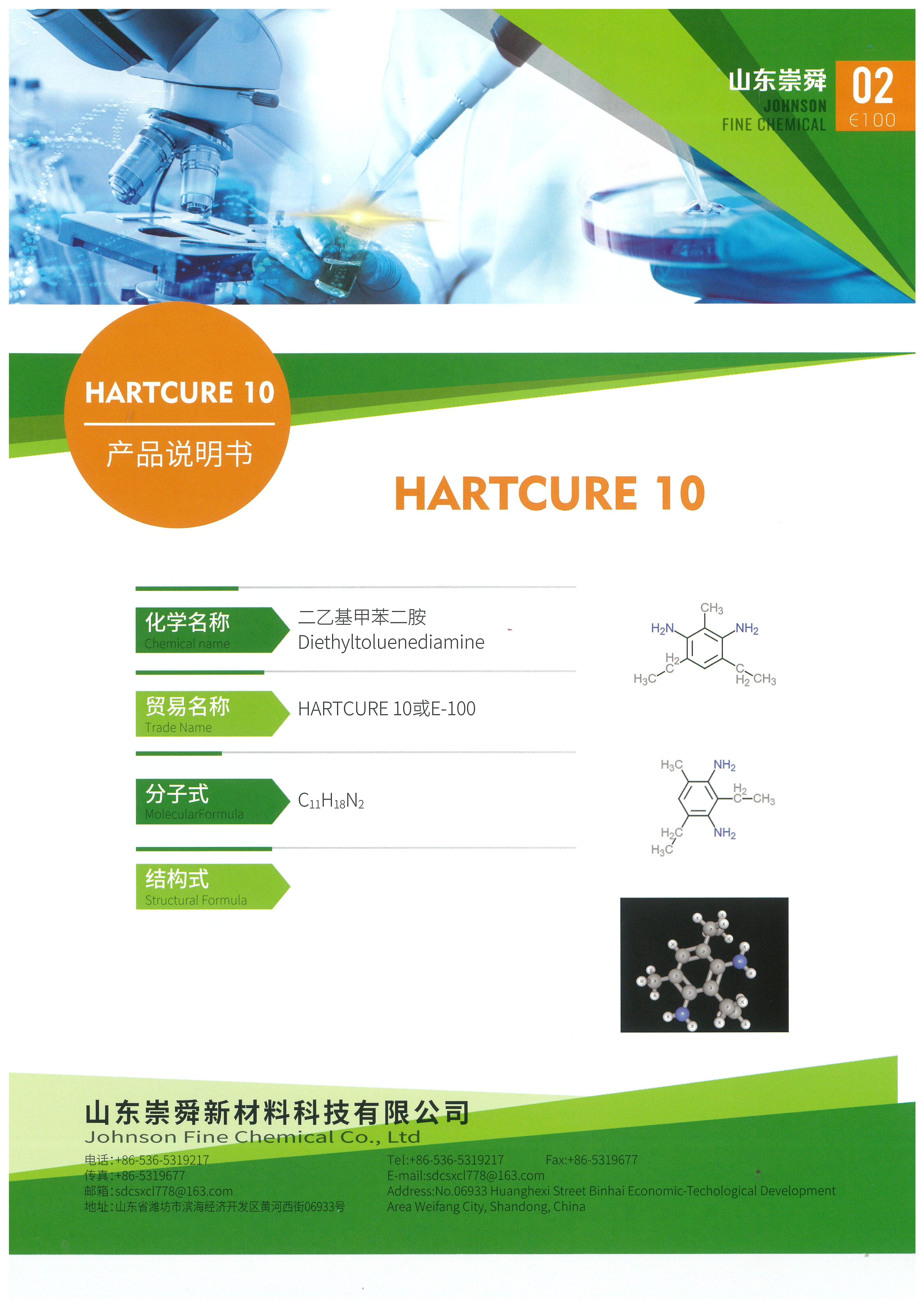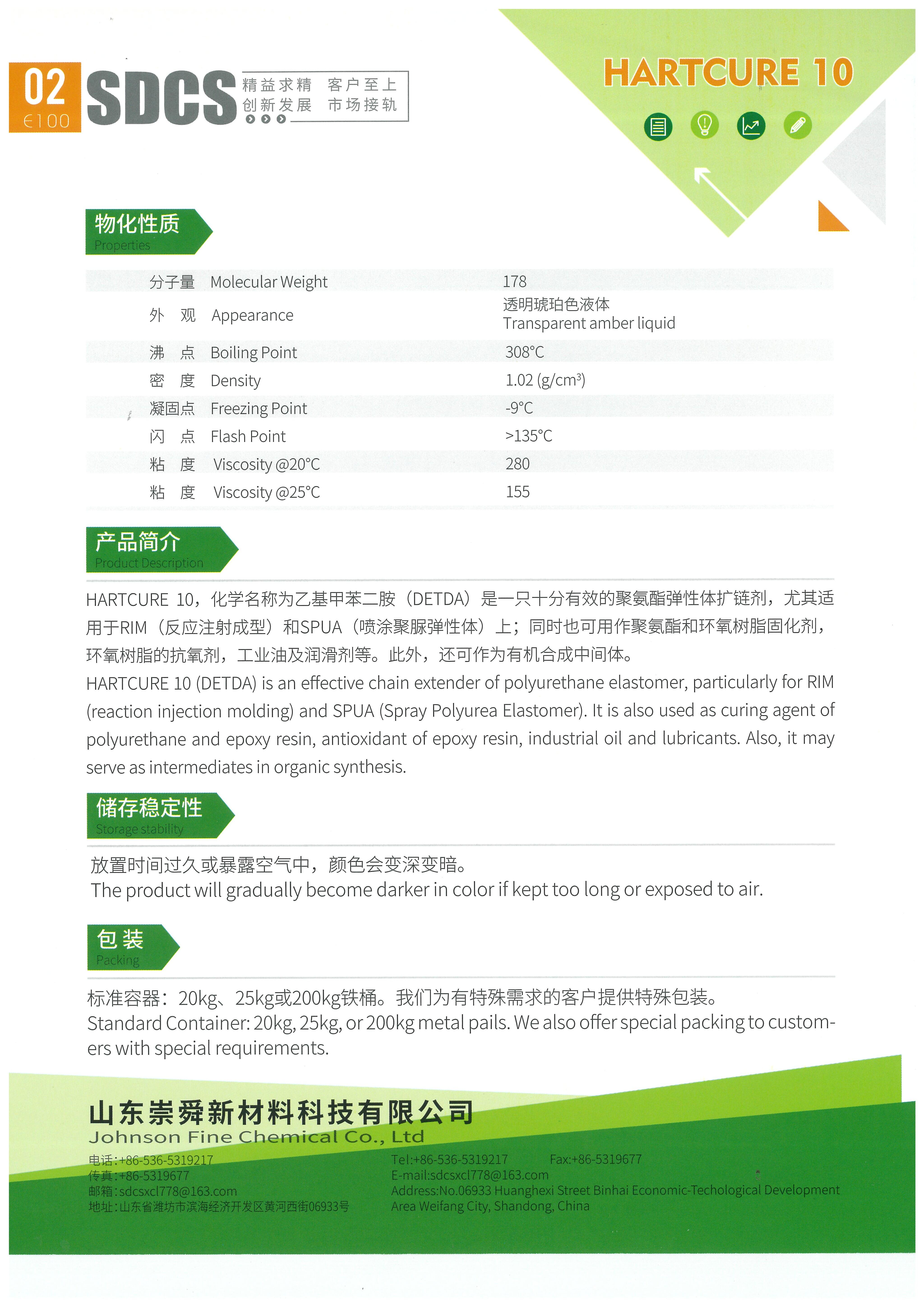 HARTCURE 10 is a liquid-type aromatic curing agent and chain extender, predominantly employed in polyurea and polyurethane systems. It is optimally formulated for applications such as Reaction Injection Molding (RIM) and Spray Polyurea Elastomer (SPUA) processes. HARTCURE 10 (DETDA) ensures rapid curing and thorough surface drying of polyurethane and epoxy resin coatings, effectively sealing and protecting floors, external walls, roofs, and bridges. In terms of use in PU products, HARTCURE 10 demonstrates superior mechanical performance. Its low viscosity enhances ease of application. Moreover, HARTCURE 10 (DETDA) offers the benefits of reduced toxicity and enhanced environmental friendliness compared to HARTCURE M.