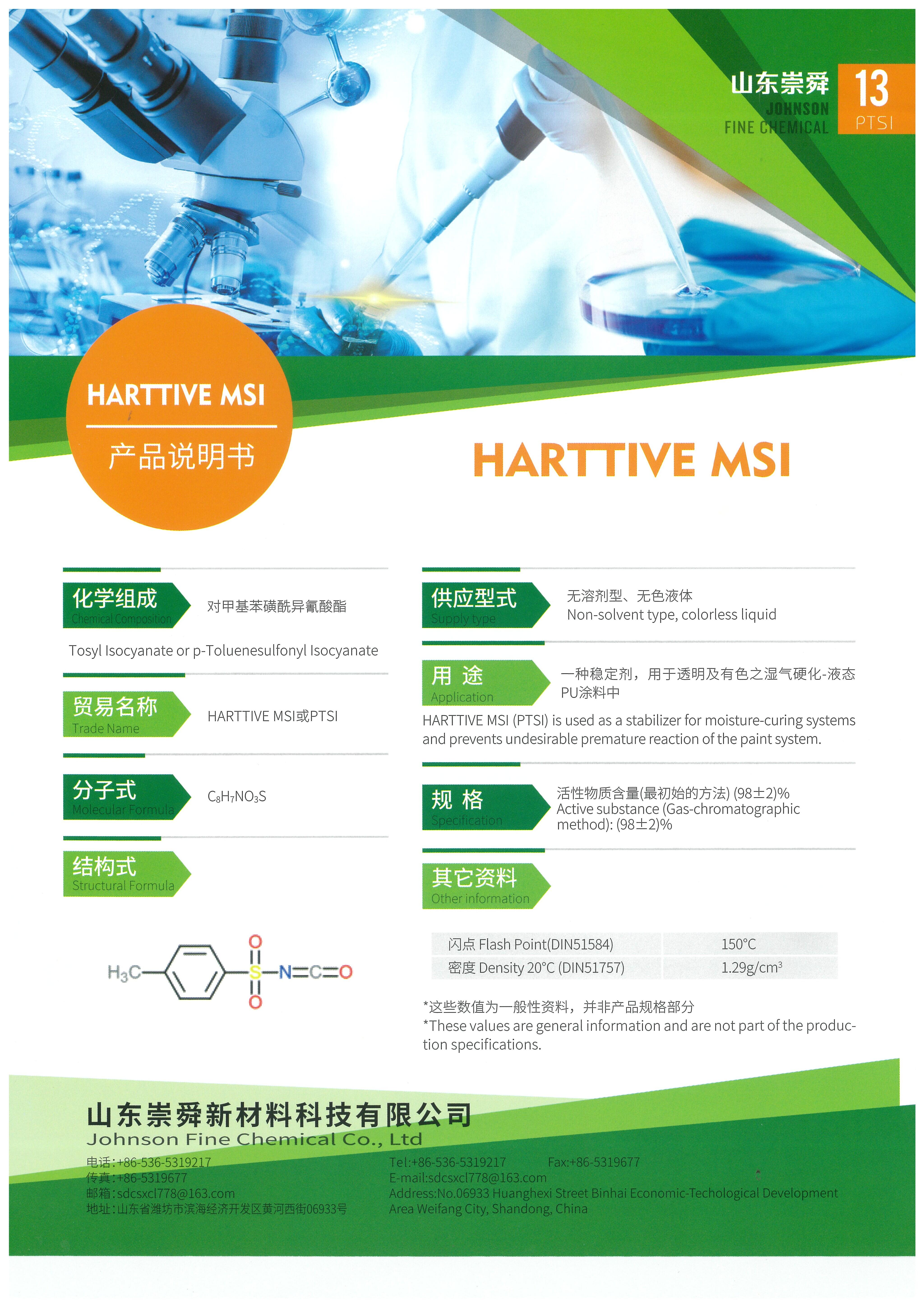 HARTTIVE MSI (PTSI) is a mono-isocyanate with high reactivity, widely employed as a dehydrating agent in chemical products, including solvents, fillers, pigments, and pitch tar applications. It also functions as a moisture scavenger for solvent-based PU coatings, sealants, adhesives, and serves as a chemical intermediate. In PU coating/paint applications, HARTTIVE MSI can prevent undesirable premature reactions and act as a stabilizer for moisture-curing materials, preventing deterioration or discoloration during storage.